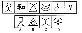 解析:本题所给出的五个图形均是由一个闭合的元素和一个开放的元素构成。符合这一规律的只有D选项。