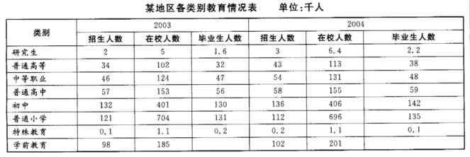 解析:该地区普通高等教育2004年毕业生人数为3.8万人,2003年为3.2万人,(3.8-3.2)÷3.2......